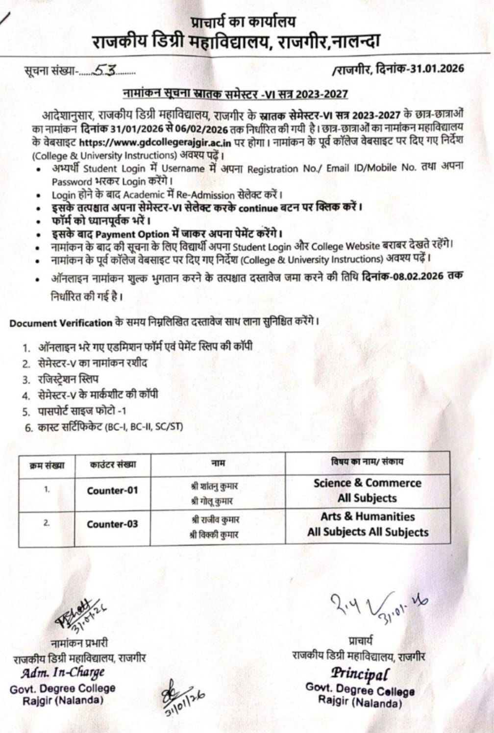B.a,B.sc,B.Com Semester-6 Session 2023-27 नामांकन दिनांक 31/01/2026 से 06/02/2026 तक निर्धारित की गयी है। छात्र-छात्राओं का नामांकन Online करेंगे। नामांकन के पूर्व कॉलेज वेबसाइट पर दिए गए निर्देश (College & University Instructions)