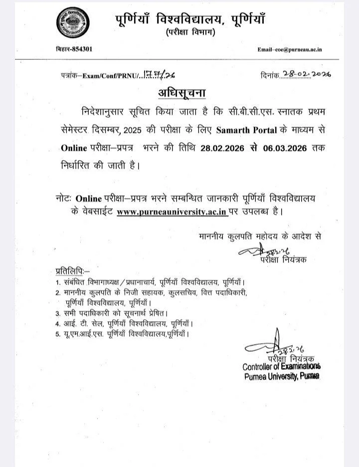 पूर्णिया विश्वविद्यालय द्वारा UG 1st Semester Exam Form केवल Samarth Portal के माध्यम से ऑनलाइन भरा जाएगा।